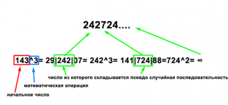 Естественно такие генераторы никак не могут работать в условии онлайн казино, в которых случайное число выдаётся за мили секунды во время спина в слоте. И на помощь пришли великие математики и программисты, которые изобрели генератор псевдослучайных чисел. Работает это так, что изначально поданное число начинает математически преобразовываться. Самый легкий пример изображу на схеме нижеБерём начальное число и совершаем с ним различные преобразования, лично я выбрал просто возведение в куб. Далее из получившегося числа выделяем три числа (допустим всегда сотые, тысячные и десятитысячные), записываем число в строку и снова проводим с ним математическое преобразование, выделяем из получившегося числа три цифры и снова записываем их за нашим предыдущим получившимся числом. И так можно преобразовывать бесконечно много, получая ПСЕВДОслучайное число.