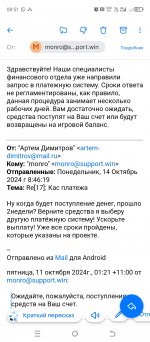 В 19:30 Поставил на вывод 5000 рублей в казино Monro. Вывод написано выполнен. Писал что деньги не поступили, просили предоставить выписку за 2 дня, потом за 5 дней. На мои письма отвечают, что с их стороны все одобрено, проблема в платежной системой. Пожалуйста, не волнуйтесь. Надеемся на Ваше понимание и доверие. Уверяю Вас, мы всегда стремимся к тому, чтобы предоставлять для Вас лучший сервис. Прошло 2 недели, уже раз 10 написал им. От казино один ответ: Здравствуйте! Наши специалисты финансового отдела уже направили запрос в платежную систему. Сроки ответа не регламентированы, как правило, данная процедура занимает несколько рабочих дней. Вам достаточно ожидать, средства поступят на Ваш счет или будут возвращены на игровой баланс.
