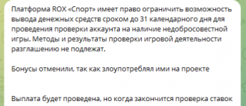Ландо всё отсылаю им, они проверяют. Пишут всё гуд доки приняты, можете ставить на вывод. Ставлю 11 сентября на вывод, он висит 12 часов. Опять пишу в поддержку и тут они меня ошарашивают, что выплата задержана на 31 день платформой ROX спорт для проверки акка на наличие не добросовестной игры!